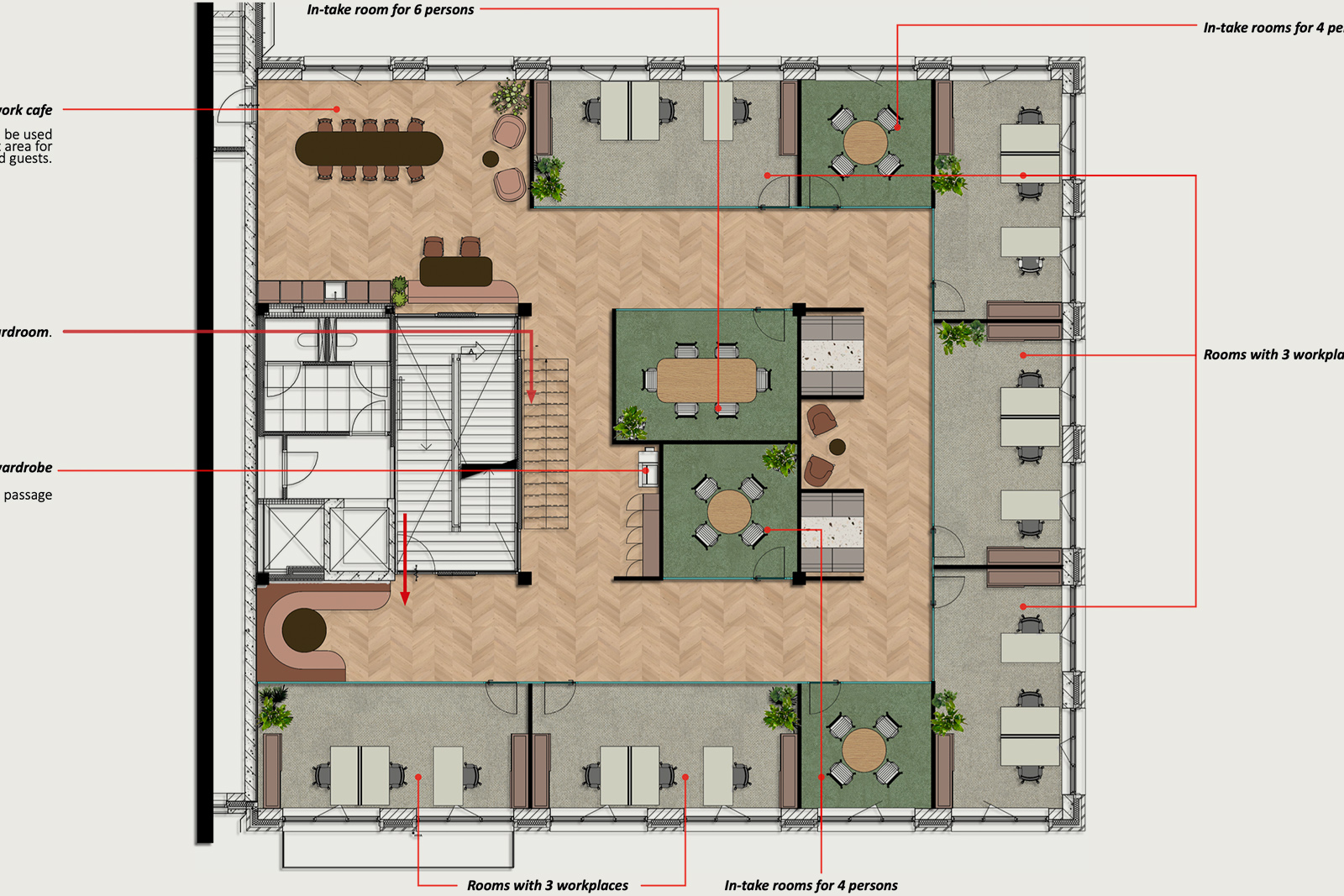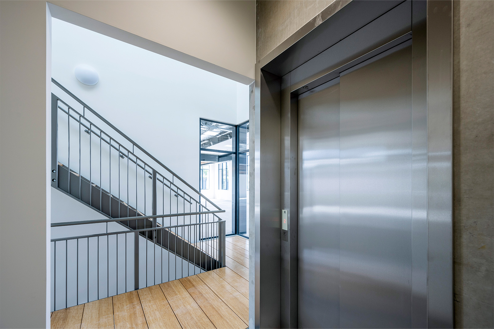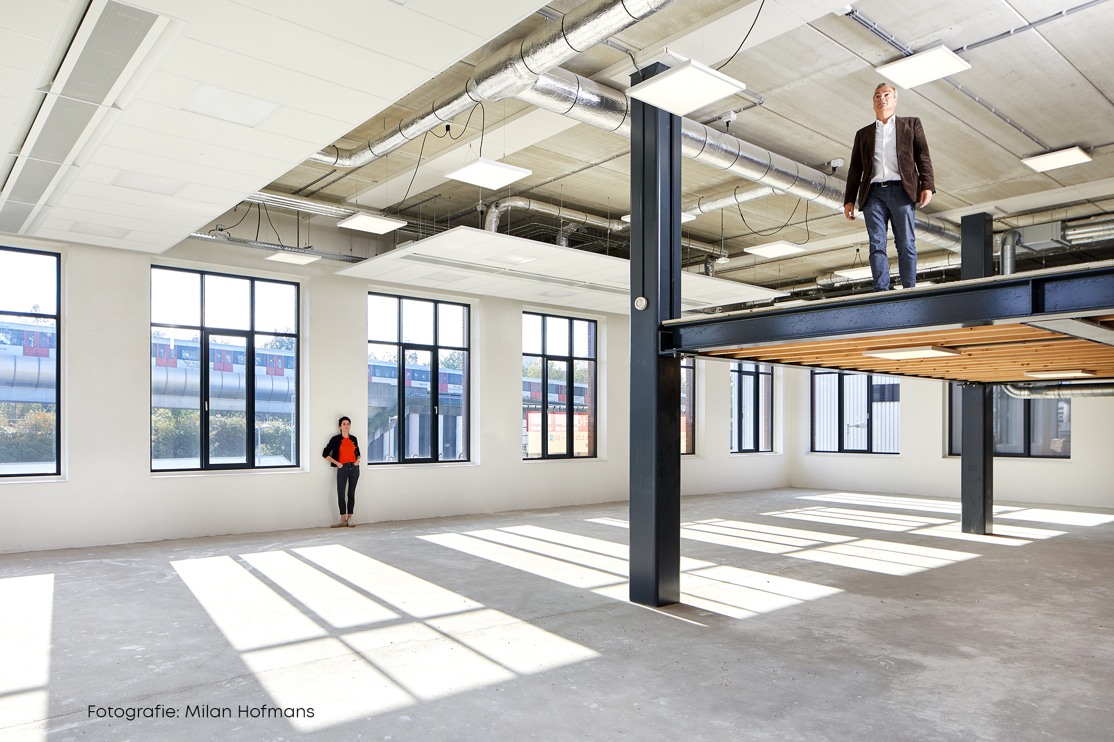 Het kantoorgebouw springt in het oog met een rode bakstenen façade en de grote raampartijen aan drie zijden die voor veel natuurlijk licht zorgen. De verdiepingshoogte van bijna 5 meter is ongekend voor een kantoorgebouw van dit formaat en draagt bij aan een gezonde en inspirerende werkomgeving. Op de begane grond is domoticabedrijf Loxone gevestigd en op de tweede etage Solyne, een projectbureau voor professionals. De eerste etage is nog beschikbaar.